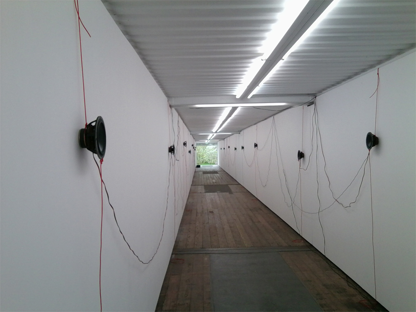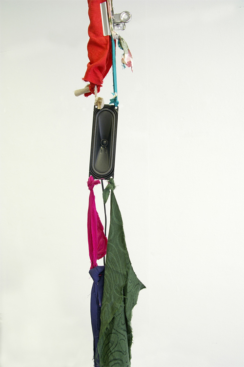 Das Gegenstück zur nicht ganz ernst zu nehmenden Gefahr aus der Tiefe bildet „küssen“, derzeit in der Gesellschaft für Kunst und Gestaltung in Bonn zu sehen. Die optische Anmutung ist, passend zum Thema, bunt und fast schwerelos: Wie Botschafter einer viel beschworenen Leichtigkeit des Seins werden Lautsprecher an aneinandergeknoteten Stofffetzen befestigt. Aber die aus ihnen entsendeten Kussgeräusche wirken nur anfangs erheiternd. Im Laufe der Zeit leidet das eigene Körperempfinden unter der zunehmend unerträglicheren Kuss-Beschallung, bis der Eindruck kippt in die peinigende Vorstellung von etwas Klebrigem, Saugendem, das sich partout nicht abschütteln lässt. Allmählich verwandeln sich die tönenden Stofffetzen in Personifizierungen der küssenden Protagonisten. Das im Raum umherwandernde Kuss-Konzert dreht sich wie in einem Reigen weiter und weiter sinnlos und heiter um die eigene Achse. (Zum Klangausschnitt)