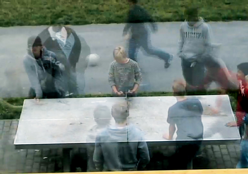 Wie die Stille zum Geräusch, gehören zur Bewegung aber auch retardierende Mittel wie Verlangsamung und Verzögerung. Sie bestimmen ihre jüngste Videoarbeit „Blow Up“, die 2012 für eine gemeinsam mit Frauke Wilken durchgeführte Ausstellung im Berliner Kunstverein Tiergarten entstand. Der Blick durchs Fenster zeigt eine Gruppe etwa zwölfjähriger Jungs, die um eine Tischtennisplatte herum miteinander agieren, allerdings ohne Tischtennis zu spielen. Die Platte ist das leere Zentrum einer Handlung an den Rändern, die sich durch Spiegelungen, Überblendungen, Doppelungen und Einfärbungen in die Zeit und den Raum hinein ausweitet. Wieder korrespondiert mit den Bildern die Tonspur als gleichwertige Ebene. O-Ton wechselt mit Krähengeschrei und plötzlicher Stille, wenn der Ton für Momente ganz abgeschaltet wird. Zwischen Bild und Ton entwickeln sich ähnlich vielfältige Beziehungen wie zwischen den jungen Menschen in ihrer für Außenstehende völlig undurchschaubaren Interaktion. Die fast austauschbar erscheinende Szene wandelt sich durch die zeitliche und räumliche Dehnung in eine zwingende Parabel über das Prekäre des jugendlichen Lebensalters.