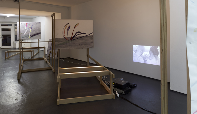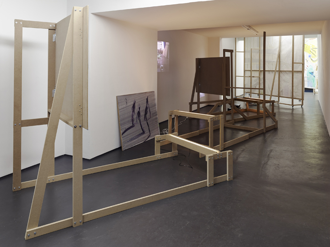 Zunächst glaubt man, in die Aufbauarbeiten zu einer Ausstellung geraten zu sein: Gestelle aus Holzlatten, die ihren endgültigen Platz noch nicht gefunden zu haben scheinen, verstellen den Weg. Doch die drei lose hintereinander stehenden Konstruktionen haben eine Funktion: Sie bilden Stillagen für groß formatige Zeichnungen von Anna K.E. Die Ausstellung der der jungen, aus Georgien stammenden, heute in New York lebenden Künstlerin bei Figge von Rosen ist eine komplexe Installation, die skulpturale Raumobjekte, Zeichnungen und projizierten Bildern umfasst.