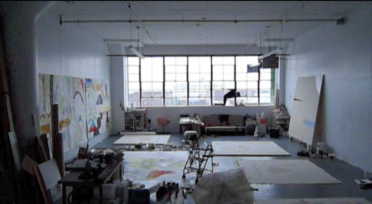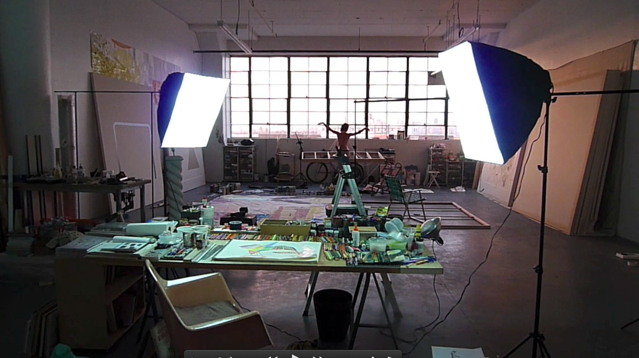 Anna K.E. präsentiert uns ihre Arbeiten auf Augenhöhe und darunter. Mit vor ihren Bildern gelagerten Dachlatten lädt sie jeweils einen Betrachter zum Sitzen und intimen schauen ein. Bequem ist das nicht aber Anna K.E. geht es eben immer auch um die körperliche Arbeit im Dialog mit dem Raum und der Kunst. So zeigt ein Video die Künstlerin, wie sie in ihrem Atelier mit nacktem Oberkörper, behangen mit einer schweren, an ein Bettgestell erinnernde Holzkonstruktion behangen den berühmten Solopart des „sterbenden Schwanes“ aus Piotr Tschajkowskis Ballettstück tanzt. Gekonnt, denn Anna K.E. ist ausgebildete Tänzerin, imitiert sie mit ihren Armen den Flügelschlag, geht zu Boden, steht auf, versucht immer wieder der Leichtigkeit der Choreographie trotz des an ihr hängenden Gewichtes gerecht zu werden, bis sie schließlich erdrückt von der Schwere in sich zusammensackt. Ein absurdes Unterfangen dieses Bemühen, inmitten eines mit großem Zeichentisch zugestellten Ateliers und behängt mit sperrigem Ballast ein solches Ballettstück aufzuführen. Diese Tanzpartie ist nicht der erste Film von Anna K.E., der auf die Figur des Sisyphos anspielt, allerdings, wie ihn Albert Camus in seinem 1942 geschriebenem Buch „Der Mythos des Sisyphos“ verstand: als durchaus glücklichen Menschen.
