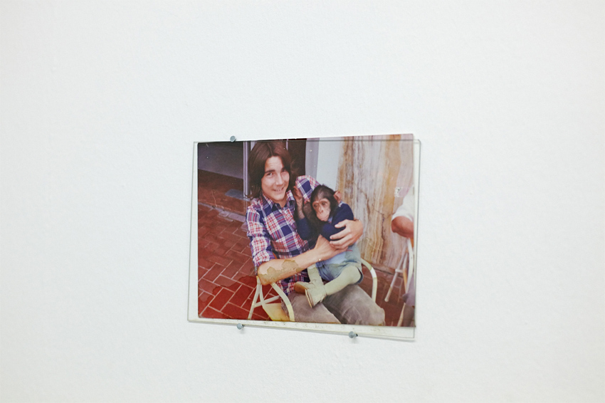 See, I was obsessed with a picture of my dad that I got last summer. It’s a snapshot of him holding a dressed baby chimpanzee when he was a teenager. His smile transpires embarrassment and the gesture of his arms towards the monkey appears to be protective; one is placed on his belly, covered by the monkey’s elbow, which is itself covered by my dad’s other hand. The boy needs one hand to allow the monkey to remain seated comfortably; the extra hand applied on the belly is the loving or protecting hand. In fact his gesture might not be protective; the lightly crouched baby animal might drive this feeling. It is slightly ambiguous whether we are embarrassed by the human holding a dressed chimpanzee or by the chimpanzee engaged in a manipulative relationship, forced to wear clothes to bring him closer to humanness.“
