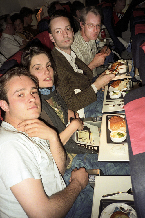 Nils Norman, Caroline Nathusius, Josef Strau und Stephan Dillemuth in der Economy Class während des Rückflugs von New York nach Köln, 21.05.1991