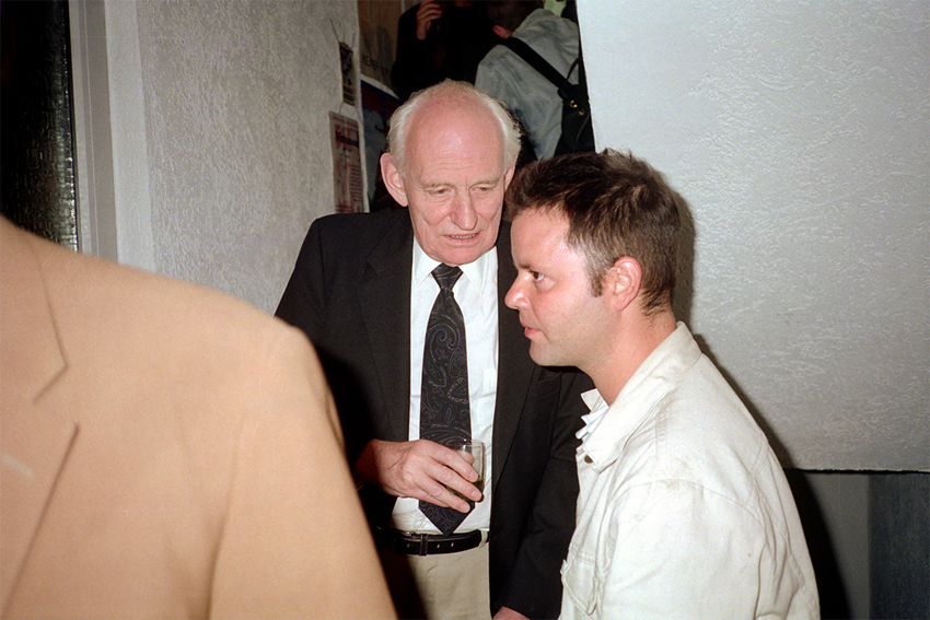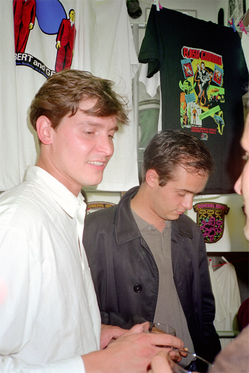 Daniel Buchholz und Nils Norman während der „T-Shirt-Party“ der Galerie Buchholz & Schipper, Köln, 17.07.1991