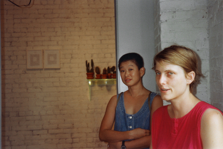 Anne Chu und Kirsten Mosher während der Ausstellungseröffnung von Laura Emrick, Sandra Hastenteufel, Kirsten Mosher, Helene von Oldenburg und Lawrence Weiner im New York Security Mini-Storage, New York, 05.04.-31.05.1995