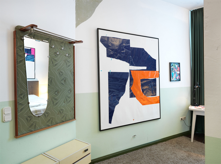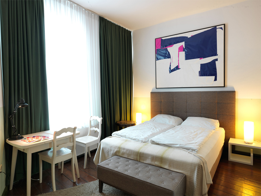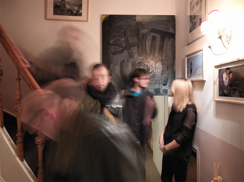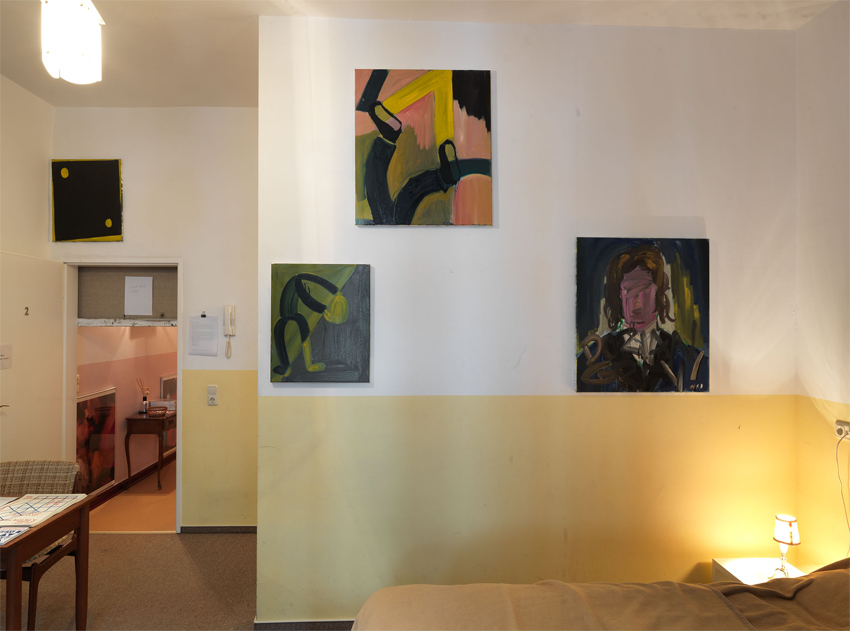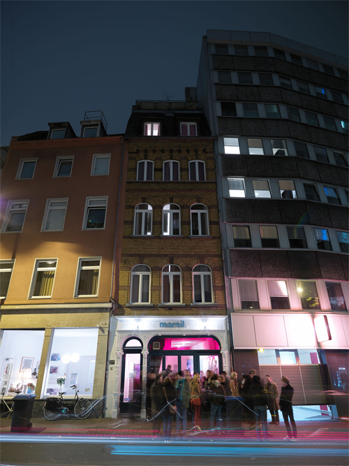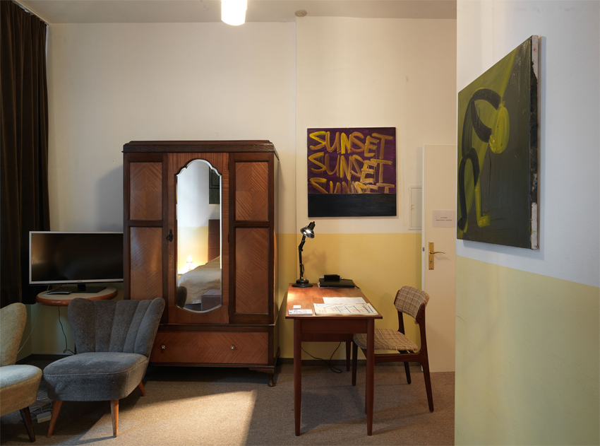 Luisa Rittershaus und Alexander Warhus luden für „Hotel International“ Galerien ein, einen durch sie vertretenen Künstler oder eine Künstlerin zu zeigen. Mit dabei waren Galerien aus Amsterdam, Wien, London, Tokio, Cape Town und sogar aus Prag, einer Stadt, die sich bisher im Galeriegeschäft eher zurückhaltend zeigte. Der Ausstellungsort war weder Galerie noch Ausstellungsinstitution, sondern das Marsil Hotel in der Kölner Innenstadt. Ein gemütliches, etwas nostalgisch eingerichtetes altes Haus, mit einem engen Treppenhaus, das im Erdgeschoß eine kleine Bar betreibt. Geführt wird das Hotel von Cyrus C. Halabian und Frank Schmitz, die sich mit vollem Enthusiasmus an dieser Aktion beteiligten und während der Eröffnung dem Bierdurst der Besucher kaum nachkommen konnten.
