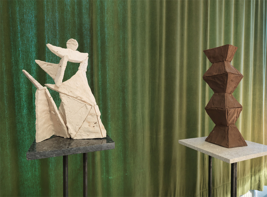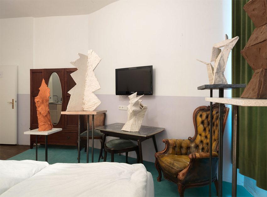 Matyas Chochola, der von der Prager Galerie Svit vertreten wird, baute überall, wo im Zimmer Platz war, seine Sockel aus Stahlröhren auf, die Marmorplatten mit modernistisch anmutenden Skulpturen aus Ton oder Beton trugen. Die aus Ton und Beton gebastelten Skulpturen wirkten unbeholfen und spannungsgeladen auf den minimalistisch eleganten Sockeln. „Postobjects“ nennt Chochola diese 2013 entstandenen Skulpturen.