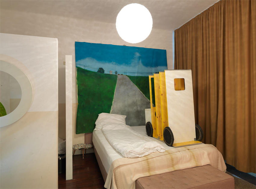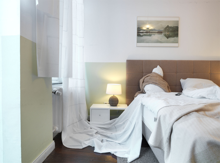 Zu sehen gab es einiges: Filme, Fotografien, Skulpturen, Collagen und auch Bilder. Verteilt auf die einzelnen Gästezimmer dienten die Kunstobjekte manchmal als geschickte Dekoration, die schon immer zur Einrichtung zu gehören schien, manchmal griffen die Künstler gewagt oder weniger gewagt in den Raum des Gästezimmers ein. So der von der Wiener Galerie Krinzinger Projekte vorgestellte Linus Riepler.
