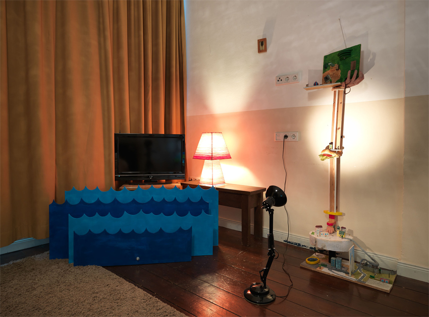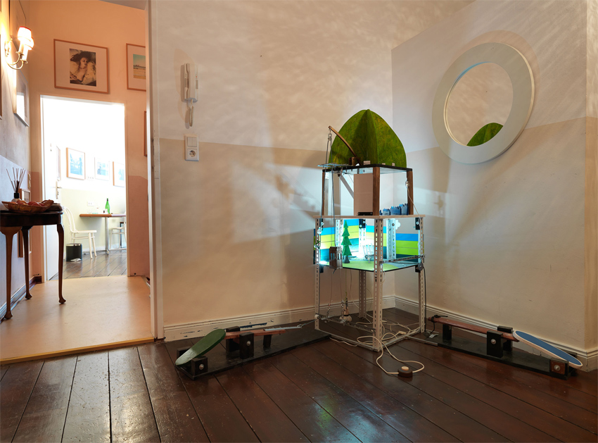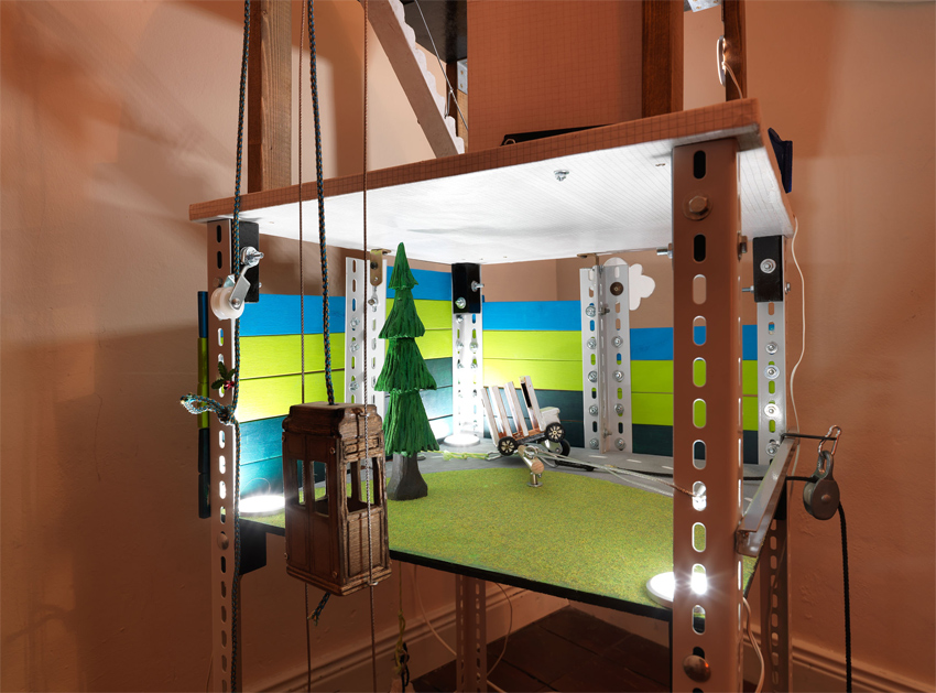 Er baut sonderbare Objekte, die eine Funktion suggerieren, in Wirklichkeit aber absurde Vorrichtungen sind. Etwa die Installation „hinterm Hügel“ im Hotel Marsil: Auf einem Brett hintereinander aufgestellte Holzplatten, an deren Seiten Räder befestigt sind, die jedoch nicht fahren können. Stattdessen stand dieses Fahrgestell aus dem Jahre 1913 „Auto (hinterm Hügel)“ wie geparkt auf dem Doppelbett des Gästezimmers. Wunderbar auch die blau bemalten, aus Holz ausgeschnittenen Wellen, die über das schwerfällige lederne Sofa krochen.