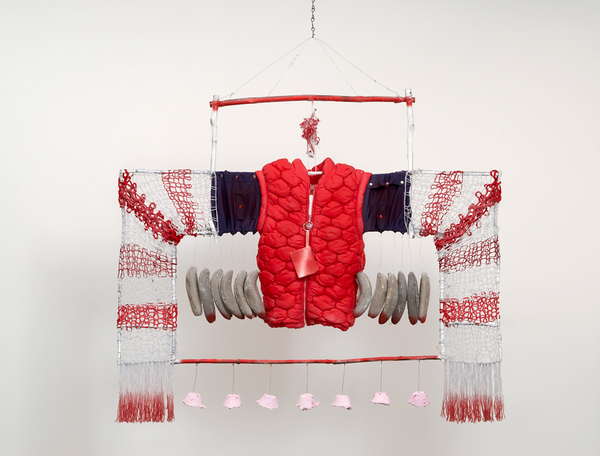 Alexandra Birckens Materialmontagen erzählen im weitesten Sinne von Kleidung – der zweiten Haut, mit der wir uns aus den vielfältigsten Gründen behängen. Mit Selbstgestricktem, Gewebtem oder Geklöppeltem umwickelt, spannt oder verknüpft die Künstlerin gefundene Materialien: Holz, Radiergummi, Draht oder Pampelmuse. »Ich kombiniere Dinge, weil sie aufgrund ihrer Oberflächen, Formen und Bedeutungen eine Energie untereinander erzeugen«, erklärt sie ihre Vorgehensweise. Wunderlich, manchmal trashig, manchmal witzig, manchmal okkult muten die Skulpturen an. Mit der neuen Arbeit Blondie untersucht sie blondiertes Echthaar auf seine Fall- und Fliesskraft, wenn sie etwa die Haarteile auf Skier montiert oder, wie bei Auntie Yaa Yaa, von geschwungenen schwarzen Ästen herabhängen lässt.