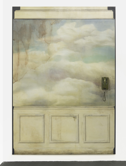 Wenden wir uns stattdessen dem von McKenzie ausstaffierten Hauptraum der Galerie zu und versuchen, das Ambiente etwas genauer zu bestimmen. Auf die Maße der Wände kalkuliert, sind vier große Gemälde dort angebracht und geben umlaufend eine spezifische Innenarchitektur wieder. Auf den ersten Blick vermittelt dieser Raum den Eindruck eines großbürgerlichen Salons, mit einer umlaufenden, halbhohen Vertäfelung, einem Kamin und zwei Türen. Die Tapete oder Malerei über den Paneelen zeigt einen kräftigen Wolkenhimmel. Dieses Interieur wirkt als Ganzes jedoch etwas schmuddelig und hat anscheinend seine beste Zeit schon länger hinter sich. So zeichnen sich stellenweise Stockflecken ab und die Spuren ehemals angebrachter Bilder sind im nachgedunkelten Fond deutlich sichtbar. Als ein sehr schönes Detail befindet sich unmittelbar neben dem Zugang ein älteres Wandtelefon, umgeben von lustigen Kritzeleien, wie sie bei längeren, nervenzehrenden Telefonaten schon mal anfallen können. Der Augen täuschende Gesamteindruck ist prächtig gelungen und wurde bei meinem Besuch am Eröffnungsabend auch noch durch die Anwesenheit einer realen fetten Fliege untermauert, die auf der Himmelstapete entlang marschierte. Demnach haben wir es hier mit einer kulissenartigen Szenarie zu tun, wobei lediglich die fehlende Möblierung auf den Leerstand hindeutet und signalisiert, dass dieser Raum nicht mehr bewohnt ist. Wo aber befinden wir uns hier und welches Theaterstück gelangt hier zur Aufführung? Oder anders gefragt: Was ist der Inhalt? Und sind wir betroffen?