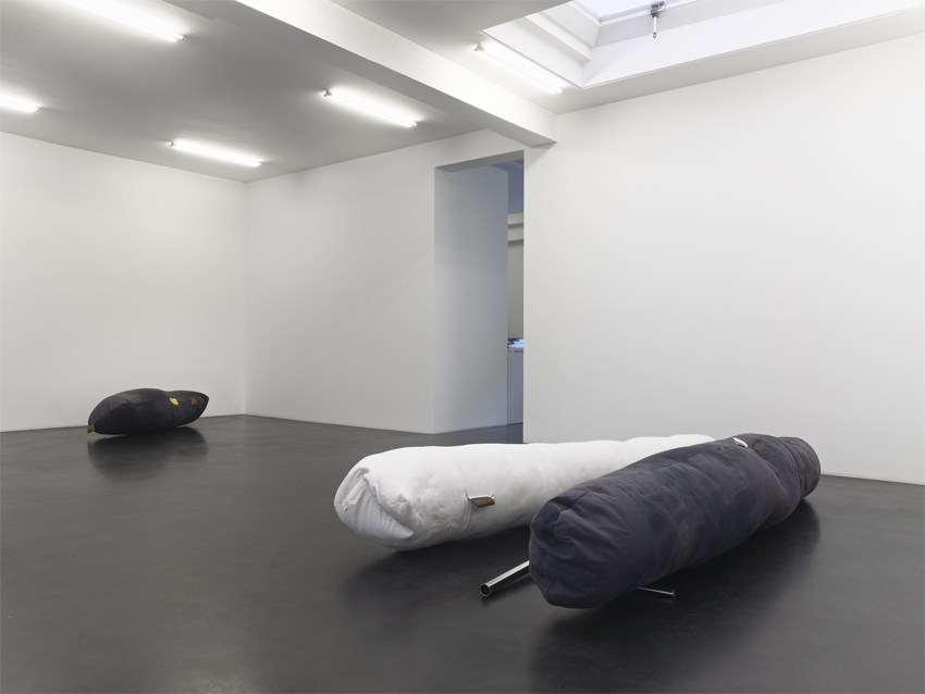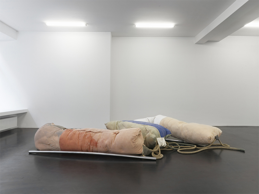 Auch in der Elisenstraße sind schon vom Schaufenster aus zwei solcher gelben Haken zu sehen. Als Wächter stehen sie da, während große wulstige Formen, wie Lemminge vor ihnen auf dem auf dem Boden liegen. Es sind blass gemusterte, gefärbte oder naturbelassene Stoffsäcke, die mit Mineralwolle und gehärteten Baumassen gefüllt sind und wie mit Luft aufgepumpt wirken. Neben diesen „Silos“ liegen verchromte Aluminiumstangen, die mit dem Titel „Gurney“ – transportable Krankenbahren – auf ihre mögliche Funktion verweisen. Wer hier wen oder was transportiert, bleibt ein weiteres Fragezeichen im Raum. Und erneut dieser Kontrast, auf den auch der Ausstellungstitel hin deutet: An sich weiches Material, wie Stoff oder Federn, weist Härte auf, die „soft sculpture“ wird zur harten Realität.