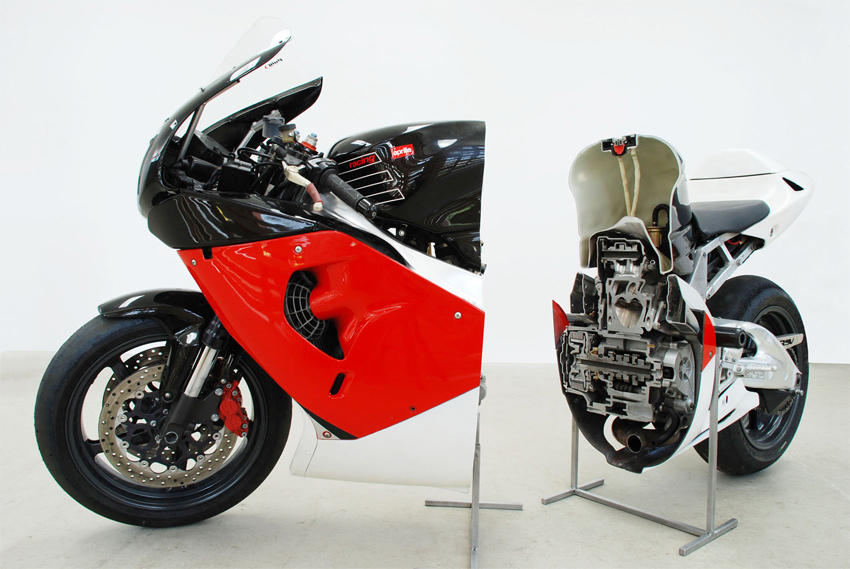 In der Mitte der Ausstellung steht ein Motorrad, es ist eine „Aprilia“, was ja schon deswegen Sinn macht, weil gerade Frühling ist. Das Ding war fahrbereit, als es angeliefert wurde. Kein Allerweltsmotorrad, vor allem der Motor ist ein besonderes Stück. Und genau hier hat Alexandra Bircken mit der Säge angesetzt, das Motorrad klappt jetzt sauber auf, zeigt alle seine Innereien und wirkt so sauber zerschnitten, dass man meint, die Verletzung ließe sich auch einfach wieder rückgängig machen, es brauche dafür vielleicht nur ein bisschen Arbeit mit dem Lötkolben. Denn eigenartigerweise hat die Geschwindigkeit ja nicht abgenommen. Die stillgestellte, tödlich weil irreparabel verletzte Maschine, wirkt noch immer vital. Wenn überhaupt stört es das Bild, dass Alexandra Bircken ihr die Wucht und Richtung zerknickt hat, aus einem schnellen, blausilbern schimmernden Pfeil eine Dreiecks-Geschichte besetzt, in dem sich unvermittelt die Akteure Ingenieurskunst, Sportlichkeit und Bildhauerei treffen. Also vielleicht kurz ausgebremst, aber nicht wirklich aufgehalten.