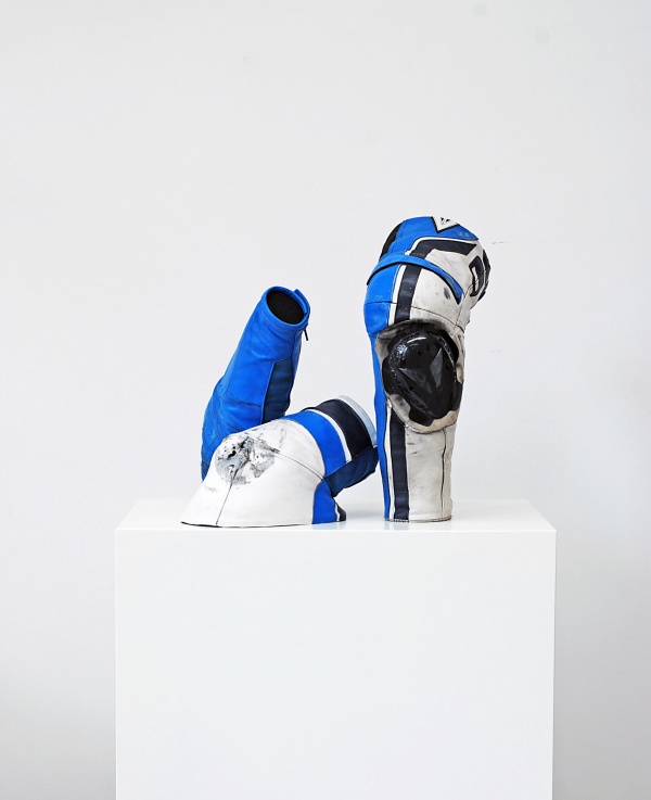 Die Körper, die man jetzt zu sehen bekommt, sind sehr präsent. Tranchiert und portioniert außerdem. Bevor Alexandra Bircken sie gehäutet hat, zerteilt und aufgesockelt, müssen sie viril und schlank gewesen sein. Vielleicht sogar muskulös. Manchmal hängen beim Metzger Schautafeln, die einem präzise darstellen, wo man ansetzen muss, um hinterher Rumpsteak, Roastbeef, Ober- und Unterkeule aus dem Leib zu schälen. Auf den weißen Sockeln der Galerie liegen Unterarme, Schultern, Rückenstücke bereit. Technisch hat Alexandra Bircken im Atelier vielleicht nur eine alte Motorradkluft etwas ausgestopft, in Stücke zerteilt und die Schnittkanten sauber verspachtelt. Die Anmutung ist aber eigen und entsetzlich: Das ist keine Leiche. Aber auch keine Puppe. Ja, die stromlinienförmig gemusterte Haut gehörte mal einem Körper, ihr waren Geschwindigkeit, Lärm und Geruch zu eigen. Es ist viel Leben entwichen, aber das ist nicht weg. Und auch vor dem breit aufgespannten Overall, den Alexandra Bircken aufgeschnitten hat wie ein Kuhfell, denkt man nicht zuallererst an den Tod, auch wenn es da hängt wie eine Trophäe, wie das fein gezeichnete Fell einer Wildkatze oder Gazelle. Aber es hat noch nicht ganz ausgeatmet – oder saugt sich gerade mit einem neuen Leben voll. So wie es der tote Balg eines Vogels kann, der im Ritual umgeschnallt wird, das Leopardenmuster, das man sich über die Uniform hängt, bevor man losmarschiert.