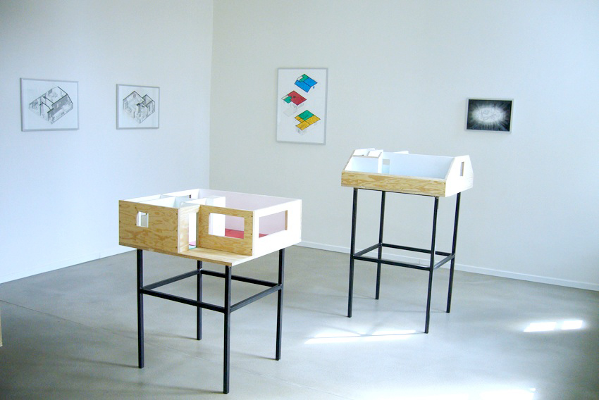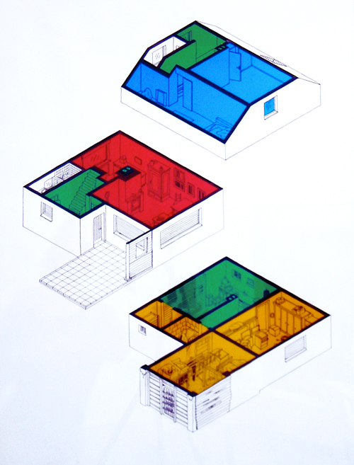 Rieves Edition mit Brille, aber auch die Sonderform der Zeitung – eine Doppelseite mit Zeichnung in der Mitte und Textbeiträgen verschiedener Autoren über den (psychologischen) Raum – referieren auf die Arbeiten des Künstlers, die es bei M29 zu sehen gibt. Die Suche nach dem »Skeleton Key« – als Hauptschlüssel oder auch Dietrich zu verstehen – und damit der Zugang zu einem künstlerischen Kammerspiel vorrangig in der Zeichnung, das aber auch in den in einem Maßstab von 1:10 gebauten Häusermodellen aufscheint. Die Holzmodelle ohne Dach legen den Blick auf eine Zuordnung von Grundfarben für bestimmte Räume frei, die der Künstler vorgenommen hat und immer wieder auch in anderen Arbeiten aufgreift. Rieve setzt sich vielschichtig mit Räumen und dem Medium Zeichnung selbst, mit Häusern und Kartografie auseinander. Isometrisch erfasst er Wohnungen, in denen allerlei Requisiten von einem Leben zeugen, das sich darin befand. Häufig sind es autobiografische Orte, die er ‚begeht‘ und auch seine eigene Person taucht immer wieder auf, in der jetzigen Serie allerdings nur auf dem Comiccover.