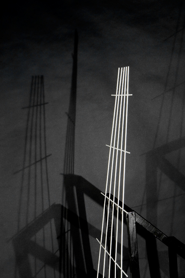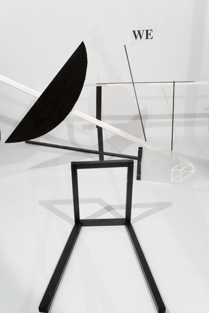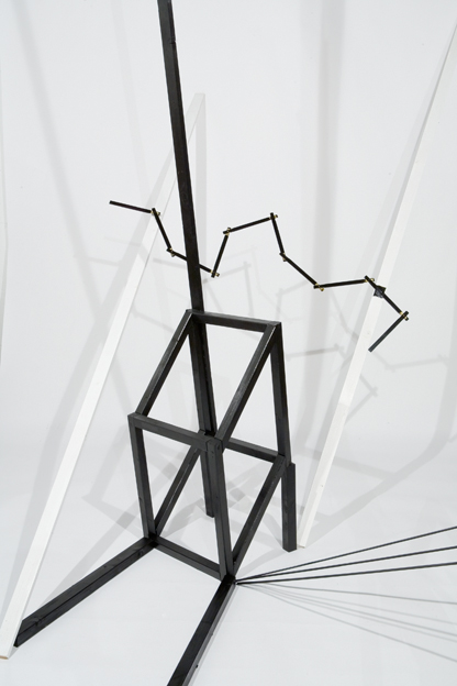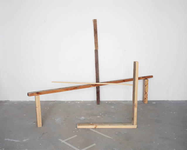 Bei der Gruppe der „Phänotypen“, die mit dem aus der Genetik entlehnten Begriff den Fokus noch stärker auf das Erscheinungsbild lenkt, kommen dieselben Holzelemente auf andere Art zum Einsatz: Hier geht es nicht mehr darum, alle vorhandenen Einzelteile zu integrieren, ohne dass das Konstrukt zusammenbricht, sondern um möglichst große Diversität. Aus wenigen, denkbar simplen Elementen lassen sich – wiederum ohne zu nageln, zu schrauben oder zu kleben – verblüffend komplizierte und variationsreiche Gebilde herstellen. Auch hier entscheidet letztlich die Perspektive, der Blick des Kameraauges, welcher Eindruck überwiegt, ob die Konstruktion als weit in den Raum kragend erscheint, oder ob sie in der Art einer Zeichnung mit der Flächigkeit der Fotografie zusammenfällt. Immer wieder tauchen solche Kippmomente auf, in denen der räumliche Aufbau optisch in die Fläche klappt, so dass die tatsächlichen räumlichen Verhältnisse kaum nachvollziehbar sind. Hier beginnt sich eine eigene medialer Wirklichkeit zu etablieren, die von der zugrunde liegenden Situation losgelöst erscheint. Dieses Auseinanderfallen von realer und medialer Wirklichkeit wird in der dritten Gruppe, den „Tipis“, mit industriell gefertigten Vierkanthölzern weitergeführt, die wie ein Bündel hingeworfener Striche einer Zeichnung wirken. Ein einzelner schwarzer oder weißer Stab bildet den Mittelpunkt dieses Beziehungsgeflechts, von dem er je nach Perspektive gehalten oder auch festgehalten wird.