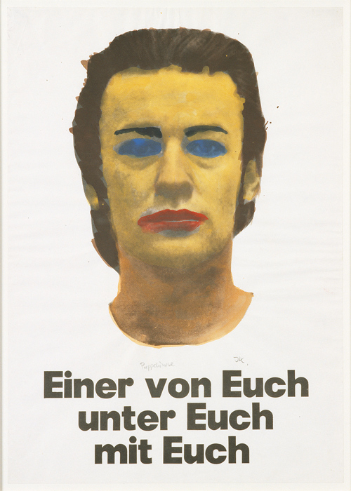 Mit Humor begegnete Kippenberger auch dem Schmerz als immer wieder seine Kollegen aber nicht er zur documenta oder zur einer der Biennalen in Venedig eingeladen worden waren. 1992 fälscht er ein documenta-Plakat und lässt seine Säufer-Laterne, eine Träne vergießend, vor dem Fridericianum samt Schwanenlogo erscheinen. 1996 stolziert er im schwarzen Mantel vor dem Deutschen Pavillon in Venedig. Nur, 1996 gab es keine Biennale. So gesehen sind seine wunderbar witzig, oft sehr aufwendig gestalteten Plakate, die in Berlin eine meterlange Wand einnehmen, Pflaster auf seine Wunden, die ihm die hartnäckige institutionelle Nichtbeachtung immer wieder zugefügt hat.