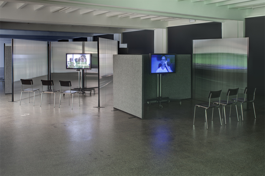 In Zeiten von Facebook, Talentshows und der alltäglichen Aufforderung zur High Performance stehen wir vermutlich schon mit einem Bein in einer solchen kapitalistischen Phase. Und auch das soziale Zusammenleben scheint sich mit seinen immer flüchtiger werdenden Begegnungen immer weiter dem System aus Angebot und Nachfrage unterzuordnen. Wie kann angesichts dessen eine Institution bestehen, die sich hauptsächlich über langfristige Mitgliedschaften finanziert, die auf Partizipation setzt und auf eine Identifikation nicht nur mit ihrem Programm sondern auch mit ihrer Geschichte hofft? Melanie Gilligan führt uns das Problem noch bewusster vor Augen: Ihre Arbeit ist nicht nur in der Ausstellung – übrigens für den sonst so low tech ausgestatteten Kunstbereich mit hier zukunftsweisenden, Sensoren gesteuerten Monitoren! – zu sehen sondern auch im Internet abrufbar (www.popularunrest.org). Gleichzeitig sitzt man in den für Großraumbüros typischen Plastikkabinen der Ausstellung ähnlich isoliert und gleichzeitig öffentlich, wie vor dem heimischen Computer. Privatsphäre wird hier ebenso in Frage gestellt wie der Kunstverein als sozialer Ort.